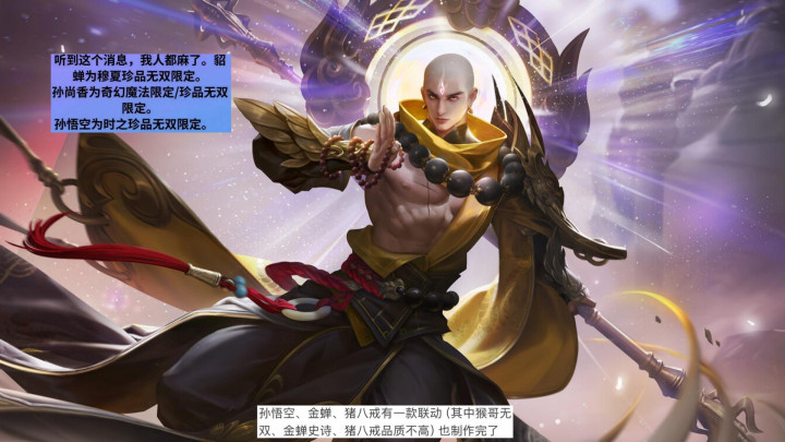 再有就是,按照其余爆料来看,孙悟空的这款无双可能还会属于联动类型,届时玩家在看到孙悟空无双的同时则是还会看到金蝉和猪八戒也迎来新皮肤的,不过他俩新皮肤的品质就很低了,一个只有史诗一个可能以更低的勇者品质进行。